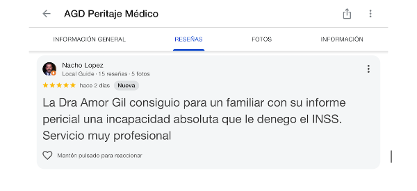 "La Dra Amor Gil consiguió para un familiar con su informe pericial una incapacidad absoluta que le denegó el INSS. Servicio muy profesional."